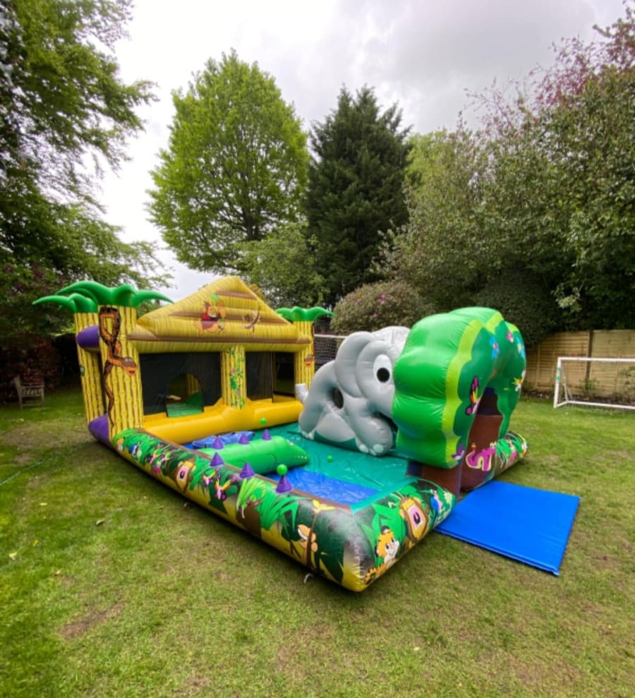 All in one Bouncy castle, ball pit with air jugglers, soft play area with 10 pieces of soft play as standard and small inflatable slide with a jungle themed inflatable surround. Suitable for 10-12 children at a time maximum age 5 years. Strictly no adults and no shoes allowed on this equipment.