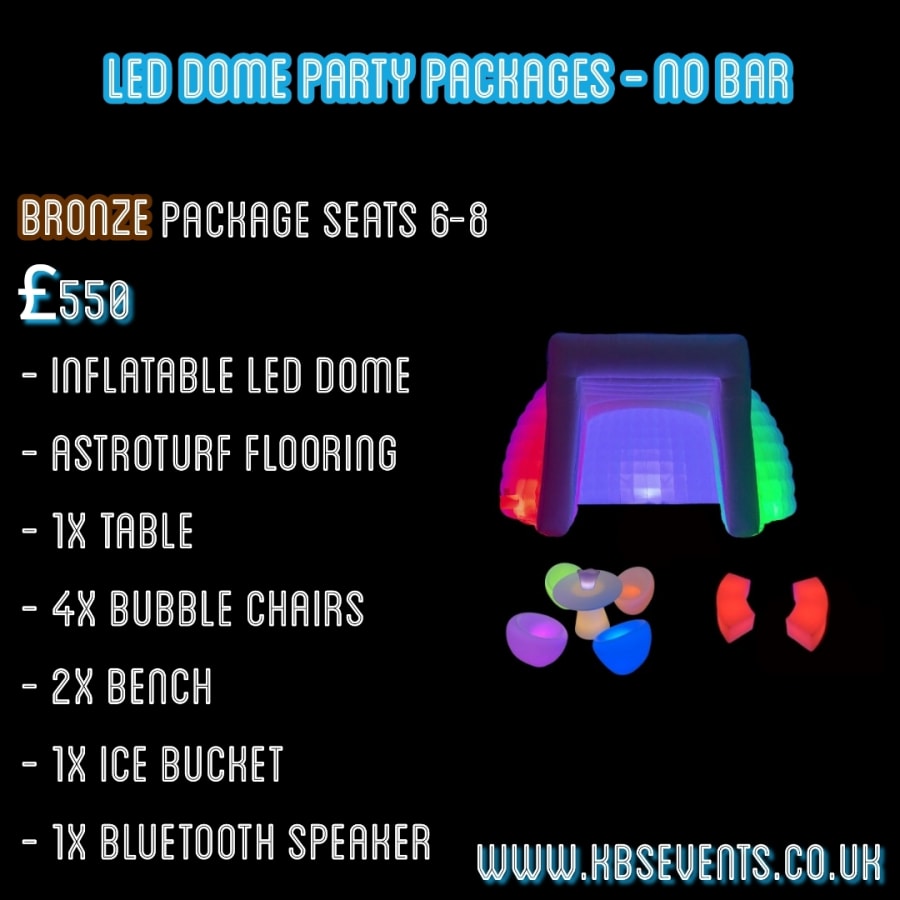 Our LED Dome & Furniture Bronze Package 1 is perfect for those looking to create a vibrant and immersive experience for their guests. With its stunning LED lights, built-in Bluetooth speaker, and stylish light-up furniture, this package is sure to take your event to the next level. Book now and let the magic unfold!