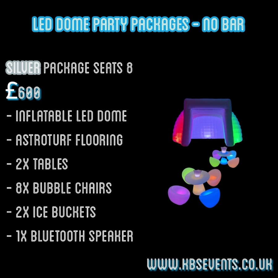 Our LED Dome & Furniture Silver Package 1 is perfect for those looking to create a vibrant and immersive experience for their guests. With its stunning LED lights, built-in Bluetooth speaker, and stylish light-up furniture, this package is sure to take your event to the next level. Book now and let the magic unfold!