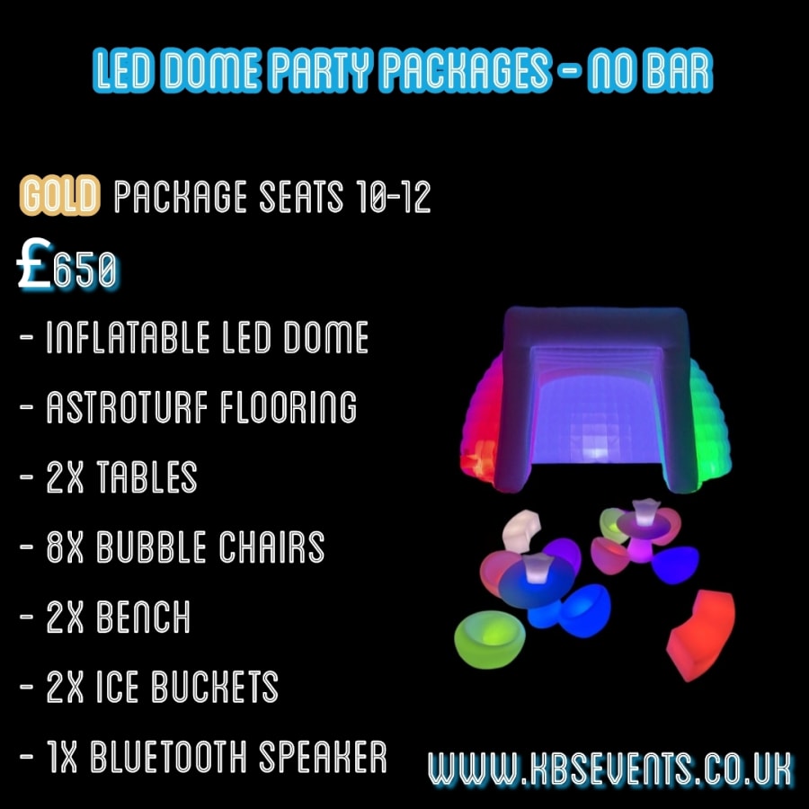 Our LED Dome & Furniture Gold Package 1 is perfect for those looking to create a vibrant and immersive experience for their guests. With its stunning LED lights, built-in Bluetooth speaker, and stylish light-up furniture, this package is sure to take your event to the next level. Book now and let the magic unfold!